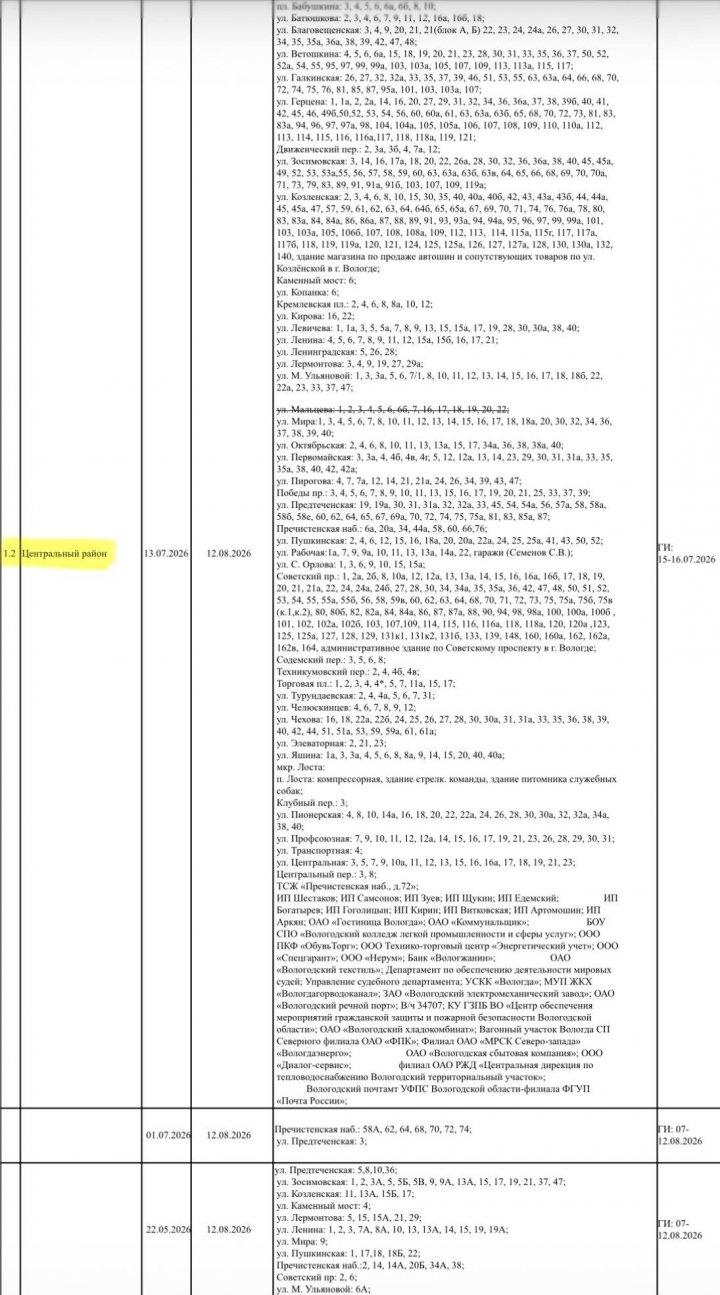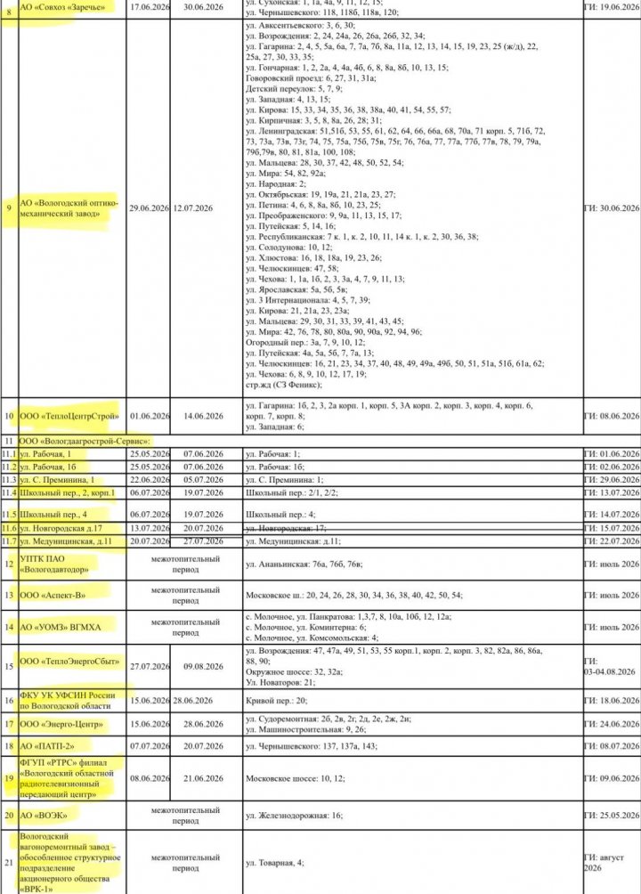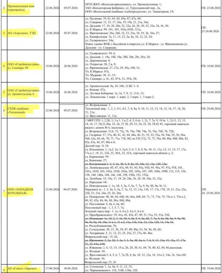 Опубликован план ремонтных работ на объектах теплоснабжения Вологды на предстоящее лето. Как следует из графика, отключение горячей воды в большинстве районов города продлится стандартные две недели, однако жителей Южного и Центрального районов ждут более длительные перерывы.