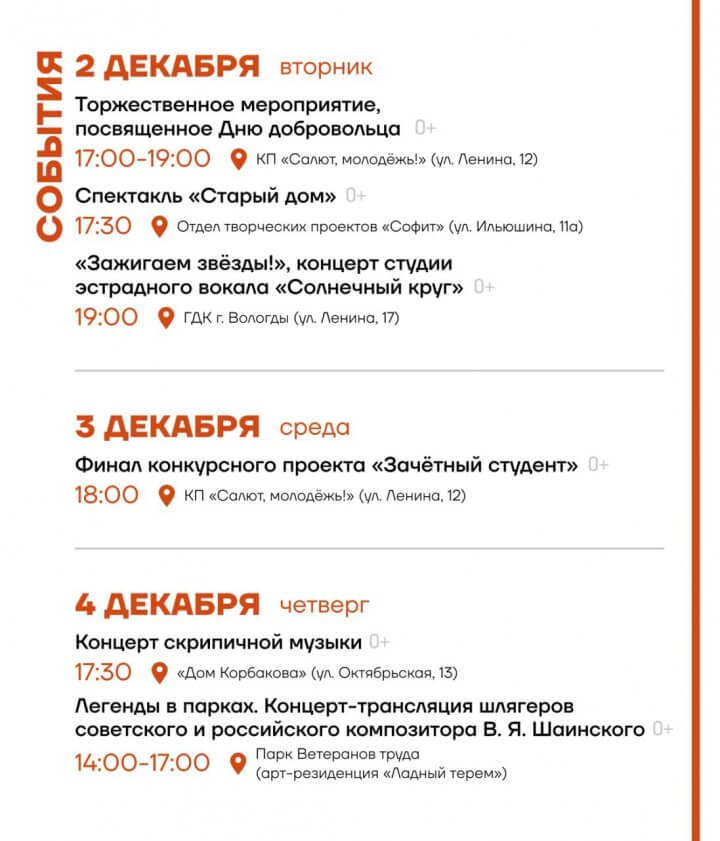 Ключевыми мероприятиями станут Кубок России по дзюдо (Череповец, 3-8 декабря), Кубок губернатора по самбо (13 декабря), Фестиваль брейкинга «Кружева» (13 декабря), а также Новогодняя ремесленная ярмарка «Сделано на Вологодчине» (19-21 декабря).