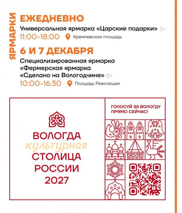 К праздникам готовят премьеры все ведущие театры региона, более тысячи детей из многодетных семей и участников СВО посетят благотворительные ёлки. Главное торжество — зажжение огней на центральной ёлке области — состоится 27 декабря на Кремлёвской площади Вологды. В новогоднюю ночь здесь пройдёт марафон «Морозный хит-парад», а 8 января — фольклорный фестиваль «Время Рождества». По всему региону устанавливаются ледовые катки, горки и новогодние композиции, в Вологде готовится бесплатный каток от компании «ФосАгро».